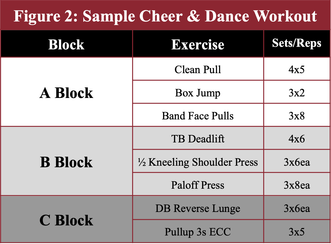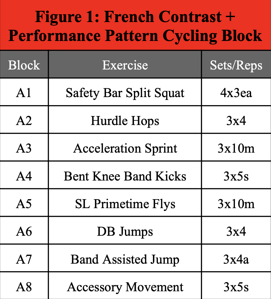 With my case at Temple with Cheer and Dance, I had around 20-40 athletes at a time in the room with maybe 2 other intern coaches to assist. Additionally, the Cheer and Dance athletes’ training age was relatively young. With these factors in mind, writing a complex program such as the French Contrast with Performance Pattern Cycling